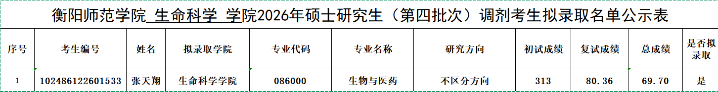 衡阳师范学院 生命科学学院2026年硕士研究生(第四批次)调剂考生拟录取名单公示表