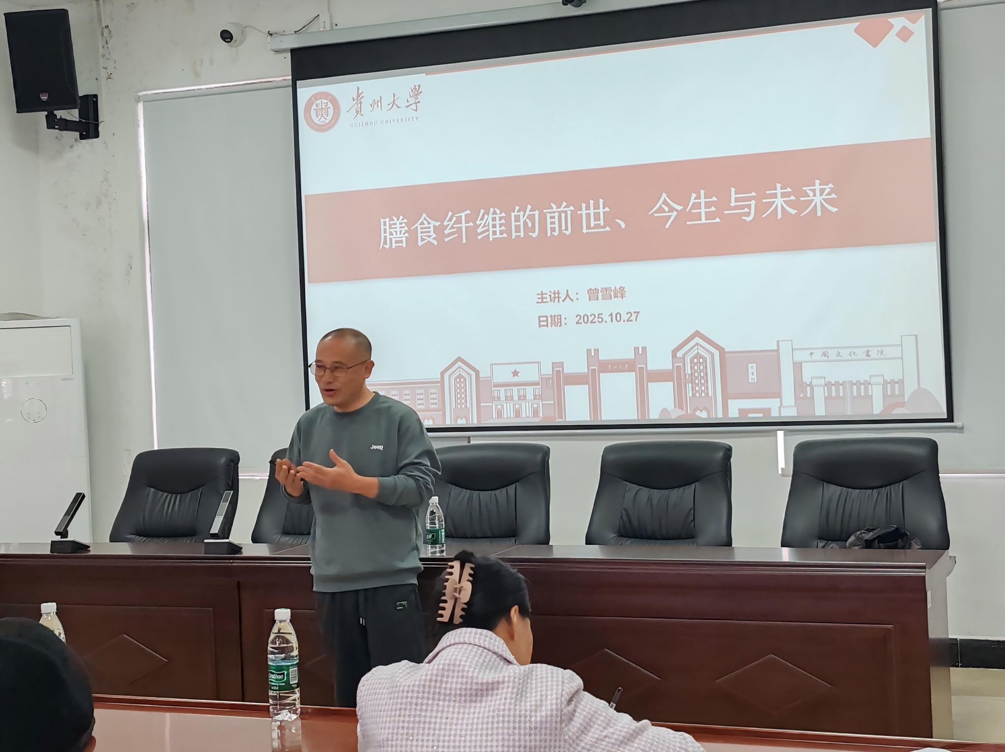 曾雪峰教授是食品科学领域资深学者,主持多项国家级、省级科研项目,发表SCI论文60余篇,其中中科院1区38篇,科研经验丰富。在营养科学的浩瀚星空中,膳食纤维是一颗既传统又充满未来感的星辰。此次会议围绕膳食纤维的三维度展开 :(一) 前世:解析膳食纤维从“无营养杂质”到被关注的认知历程,结合粮油副产物案例说明其在传统饮食中的隐性作用。(二)今生:阐述其调节肠道微生态、控血糖血脂、辅助体重管理等健康价值,介绍通过发酵改性等工艺提升其利用率的研究。(三)未来:展望其在医药载体、可降解材料、精准营养等跨界应用,分享从米糠、豆渣中提取功能性膳食纤维的技术突破。 这次讲座不仅是膳食纤维的“历史复盘”与“未来展望”,更是一次食品科学与营养健康的跨界对话。曾教授的讲座为我校食品、营养相关学科发展提供方向参考,也有利于学科跨界创新。